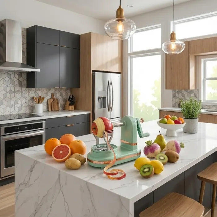 Fruitelle™ est la solution idéale pour éplucher rapidement et sans effort tous vos fruits.
